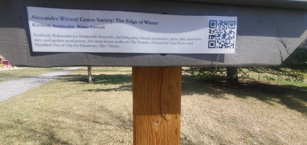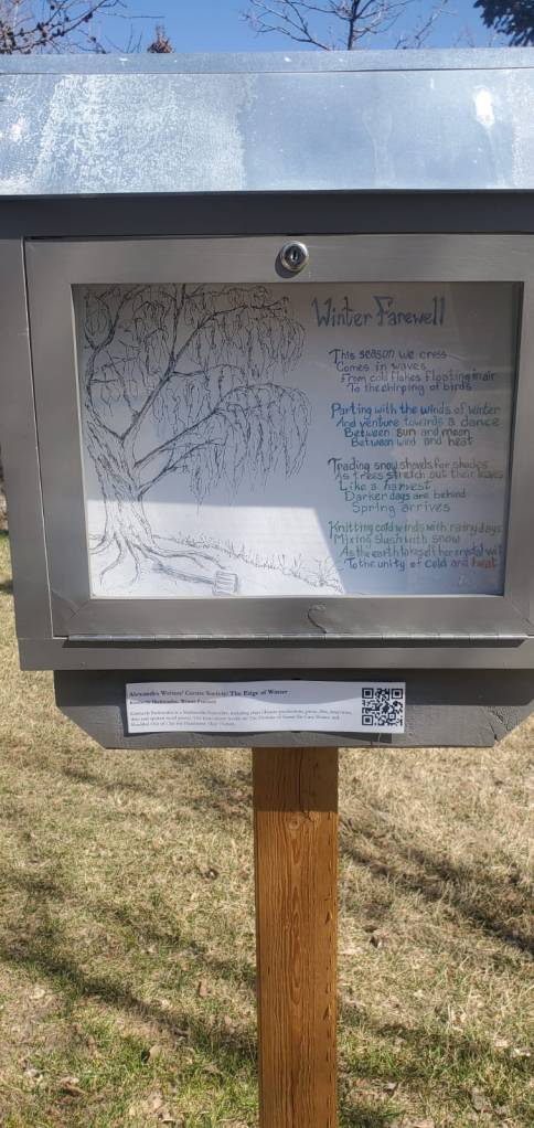 As the season changes, we look forward to summer and warmer weather. In partnership with Alexandra Writers’ Centre Society and the Crescent Heights community, I curated a poem for “The Edge of Winter”. It is an interpretation of the unique transition between winter and spring. This was displayed in the Rotary Park in Calgary, Alberta.